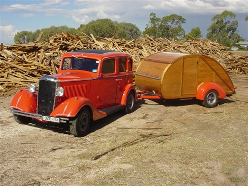 Trailer built by Peter in 2004, it has a timber skin with a steel frame; inside has a bed, kitchen table and chairs, folds out like a camper trailer.